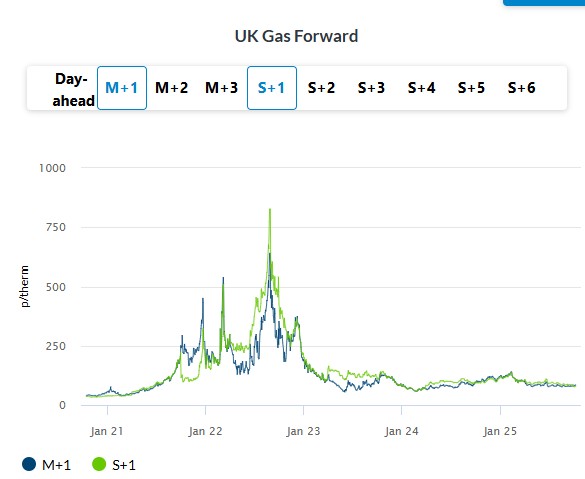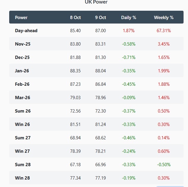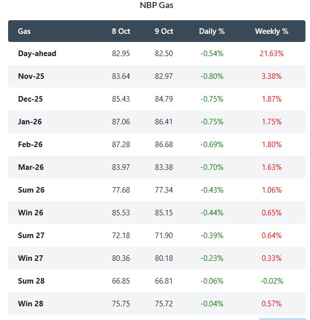 UK gas prices declined on Thursday. The NBP spot slipped 0.5% to 82.50 p/therm, aided by robust LNG arrivals from the Atlantic basin and continued flows from increased U.S. production to Europe. On the forward curve, the Sum-26 contract fell by 0.4% to 77.34 p/therm, as National Gas and NESO forecasts suggest sufficient supply for the winter season.