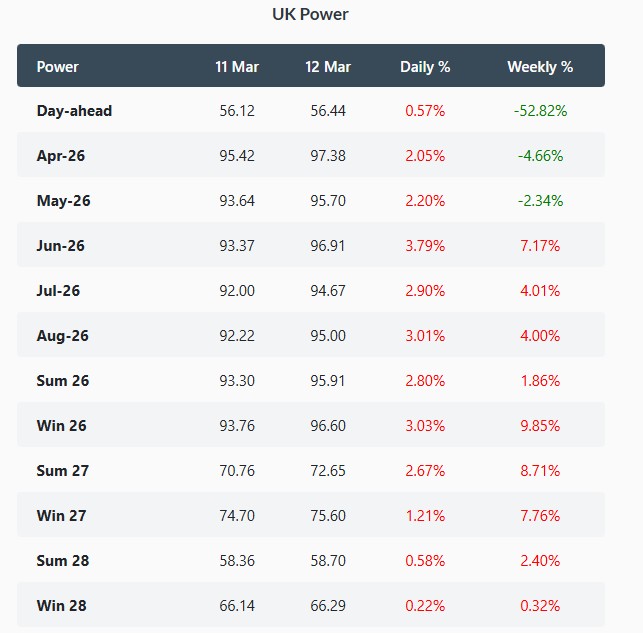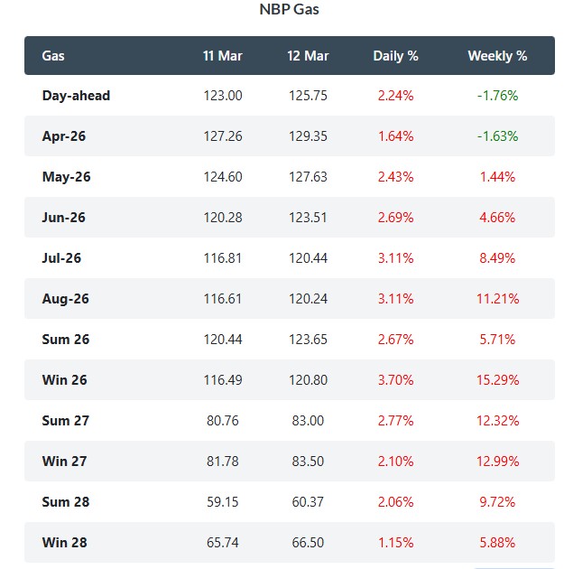 British gas prices climbed on Thursday, with the NBP spot rising by 2.2% to 125.75 p/therm amid colder weather. The Summer-2026 contract jumped 2.7% to 123.65 p/therm amid renewed Iran threats to escalate the war.