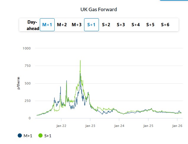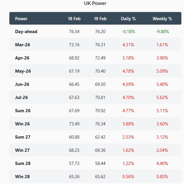 The British spot power price declined by 0.2% to 76.20 GBP/MWh as warmer weather next week is expected to reduce heating demand. Further out the curve, the Sum-26 delivery contract surged by about 5% to 67.69 GBP/MWh, tracking stronger gas prices.