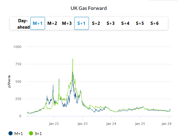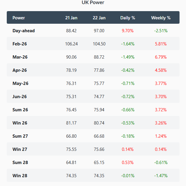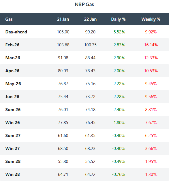 UK gas prices declined on Thursday. The NBP spot price slid 5.5% to 99.20 p/therm as updated forecasts pointed to warmer weather. Meanwhile, the Summer 2026 contract fell 2.4% to settle at 74.18 p/therm, reflecting continued market caution amid lingering geopolitical uncertainties, even as the USA and NATO countries moved toward a deal over Greenland.