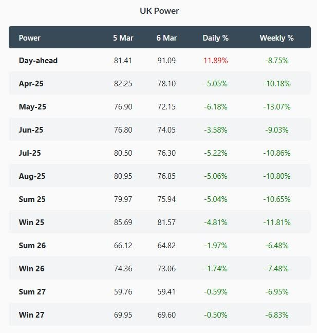 In contrast, the UK Summer 2025 delivery contract followed weaker gas prices, falling by 5% to 75.94 GBP/MWh.