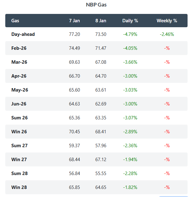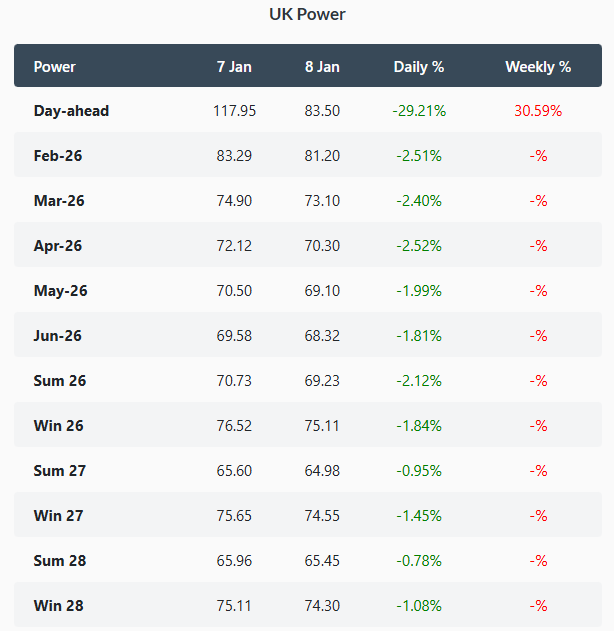 UK gas prices fell on Thursday, with the NBP spot declining 4.8% to 73.50 p/therm. The UK secured its first LNG cargo for February 2026, boosting supply prospects and relieving near-term storage concerns. On the forward curve, the Summer 2026 delivery contract dropped 3% to 63.35 p/therm, as geopolitical risk premiums eased after reports that President Zelenskiy is seeking a meeting with Donald Trump to discuss disputes over territory and nuclear assets.